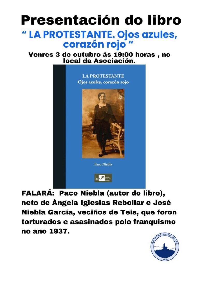 A Asociación Veciñal de Teis, organiza a presentación do libro “ La Protestante. Ojos azules , corazón rojo”, este venres 3 de outubro ás 19:00 horas, no local da Asociación. Na presentación falará o autor Paco Niebla. Este libro narra a vida de Ángela Iglesias Rebollar,…