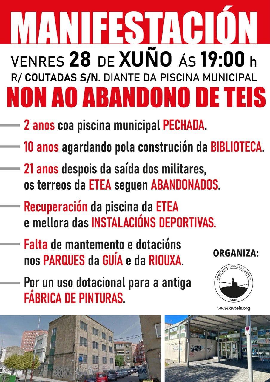 A Asociación Veciñal de Teis, convoca unha manifestación este venres 28 de xuño ás 19:00 h, con saída desde a piscina municipal, para denunciar o abandono de Teis.